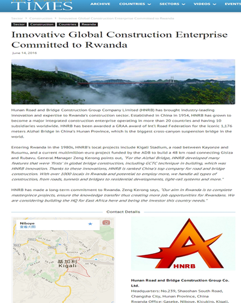 6月14日,歐洲最大的華文日報《歐洲時報》以《創(chuàng)新的全球性建筑企業(yè)投身盧旺達》為題,積極報道我“湖南路橋”。文章介紹了集團基本情況、矮寨大橋的創(chuàng)新及在盧旺達的施工業(yè)績等。這將有效幫助集團提升國際地位和國際知名度。