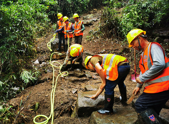 可即便施工環(huán)境如此艱苦,他們也未曾對(duì)施工質(zhì)量放松一絲一毫的要求。剛進(jìn)場(chǎng)時(shí),有一次工人們?cè)谔莸朗┕さ胶蟀胍梗磐瓿闪水?dāng)天三十余米的施工任務(wù)。但沒(méi)想到,第二天一早工人到現(xiàn)場(chǎng),才發(fā)現(xiàn)因天黑看不清楚,昨夜修好的梯道不夠美觀,于是他們二話不說(shuō),將梯道拆了重新施工,達(dá)到要求才罷休。